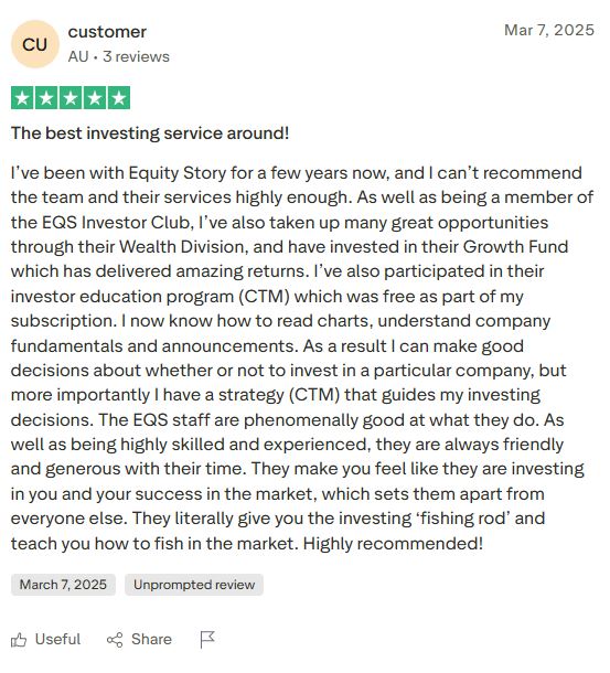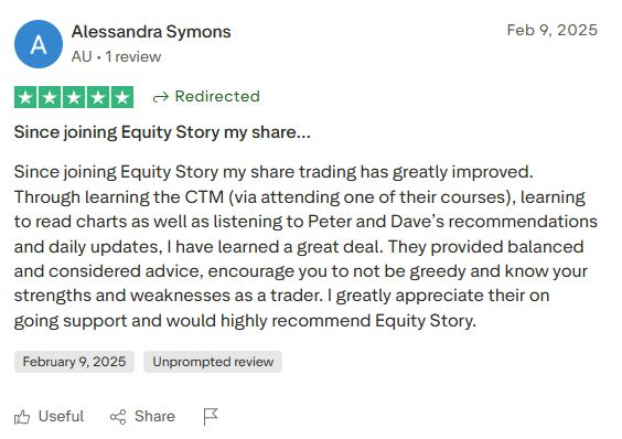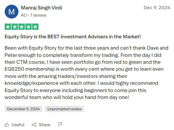General Advice Warning: The information provided by Equity Story is general in nature and does not take into account your personal financial situation, objectives, or needs. It is not personal financial advice. Before making any investment decision, you should consider whether the information is appropriate for your circumstances and, if necessary, seek professional financial advice. Past performance is not indicative of future results. Risk Disclosure: Trading and investing in the share market involves risk of loss. You may lose some or all of your capital. Never invest more than you can afford to lose. The recommendations provided are educational in nature and should not be construed as a guarantee of returns. Earnings Disclaimer: Results mentioned in testimonials and case studies are not typical and represent individual experiences. Your results may vary based on your capital, risk tolerance, discipline, market conditions, and other factors beyond our control. We make no income claims or guarantees. Testimonial Disclaimer: Testimonials appearing on this page are from real members of Equity Story. However, these results are not typical, and individual experiences will vary. We do not claim that you will achieve similar results. Refund Policy: Our 30-day money-back guarantee requires engagement with the membership content (consuming daily podcasts, attending at least one Ask The Analyst session, reviewing weekend materials). Refund requests made within 30 days that meet these engagement criteria will be processed in full. Company Information: Equity Story is an ASX-listed company operating under Australian financial regulations. For full regulatory information and disclosures, please contact [email protected].